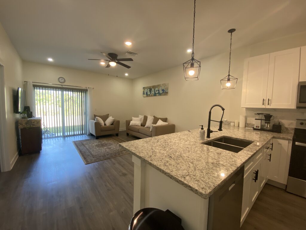 Great Location! Newer Furnished 3/2 Duplex with garage on Tetzel Avenue. Newer move-in ready 3/2 duplex in a central Englewood location. This unit has modern luxury open living with a split floor plan featuring 3 bedrooms, 2 bathrooms, and a 1-car garage. 9′ ceiling open floor plan connects the kitchen to the living areas. The kitchen features granite countertops, bright white shaker-style cabinets, stainless steel appliances, and modern fixtures, giving the home a contemporary and functional space for cooking and entertaining. The home features hurricane-impact windows and sits high in a non-flood zone. This home is conveniently located near world-class beaches, several golf courses, easy access to boat ramps, shopping, great restaurants, and several state parks. It’s perfect for your Southwest Florida Sunny Vacation! Smoking is prohibited inside the home.